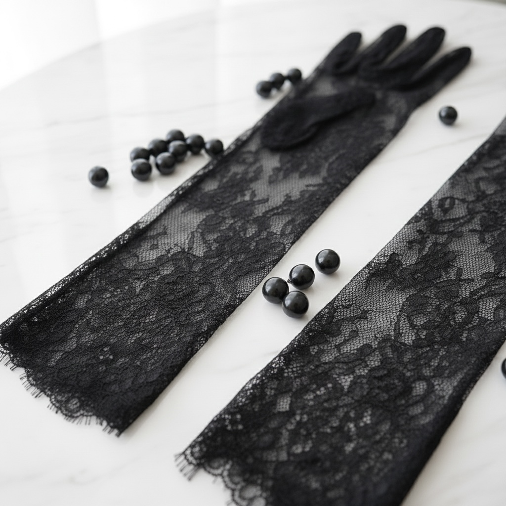 Дългите дантелени ръкавици са онзи фин детайл, който превръща визията в истинско изявление. Те придават аристократична нотка, подчертават линията на ръцете и завършват ансамбъла с неподражаема елегантност.