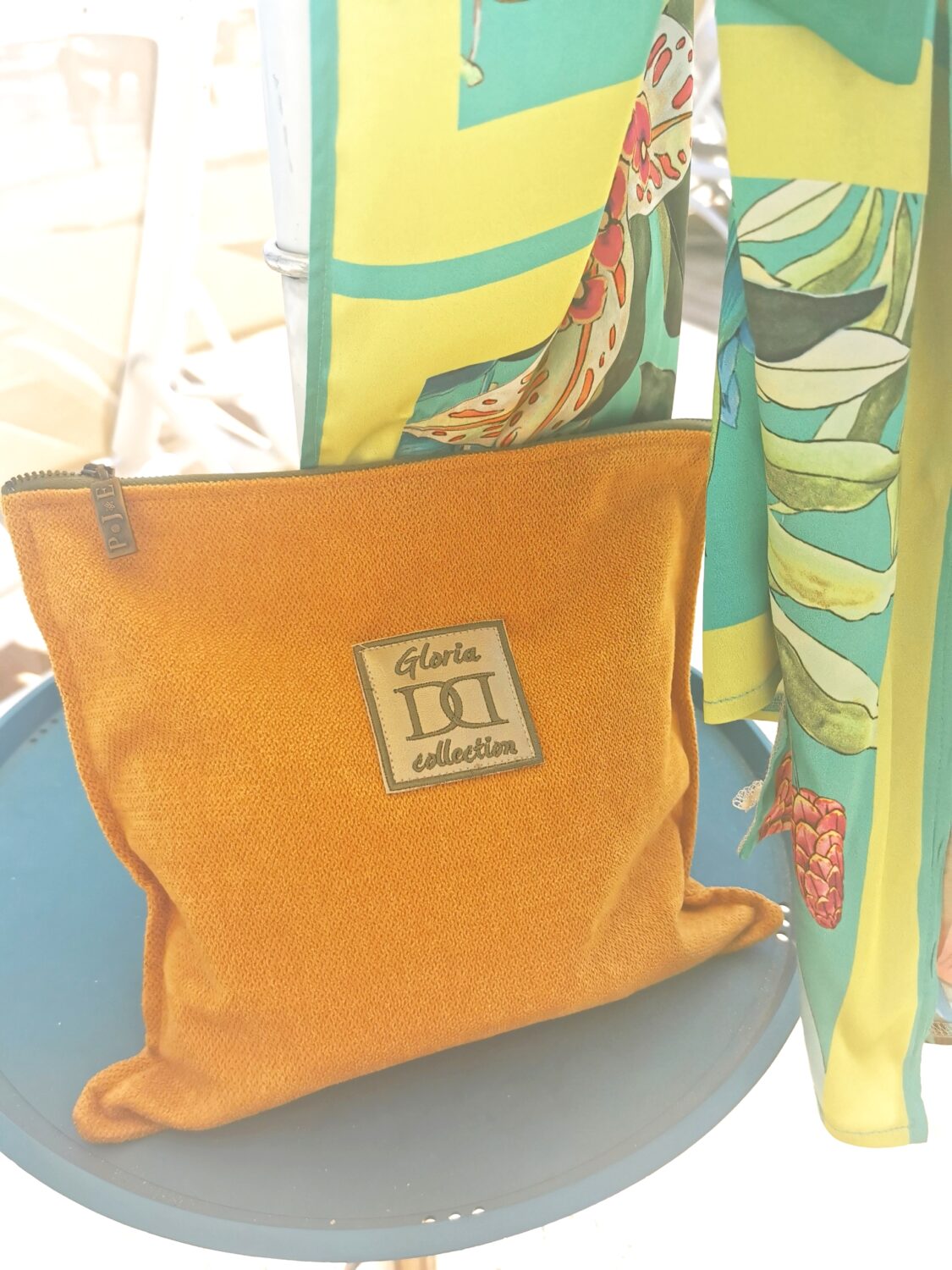 Голяма чанта с несесер изработени от здрава дамаска с кадифен ефект, събиращи всичко необходимо. Кожени нашивки с бродерия.