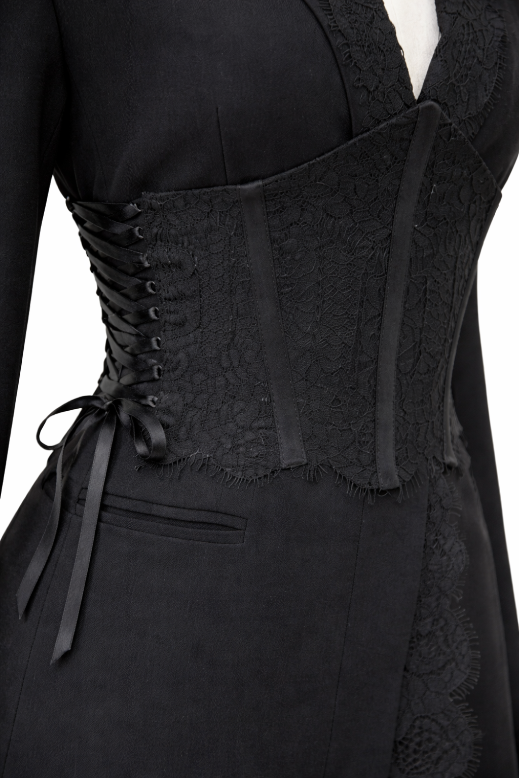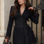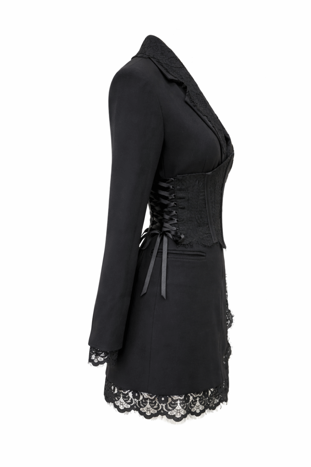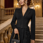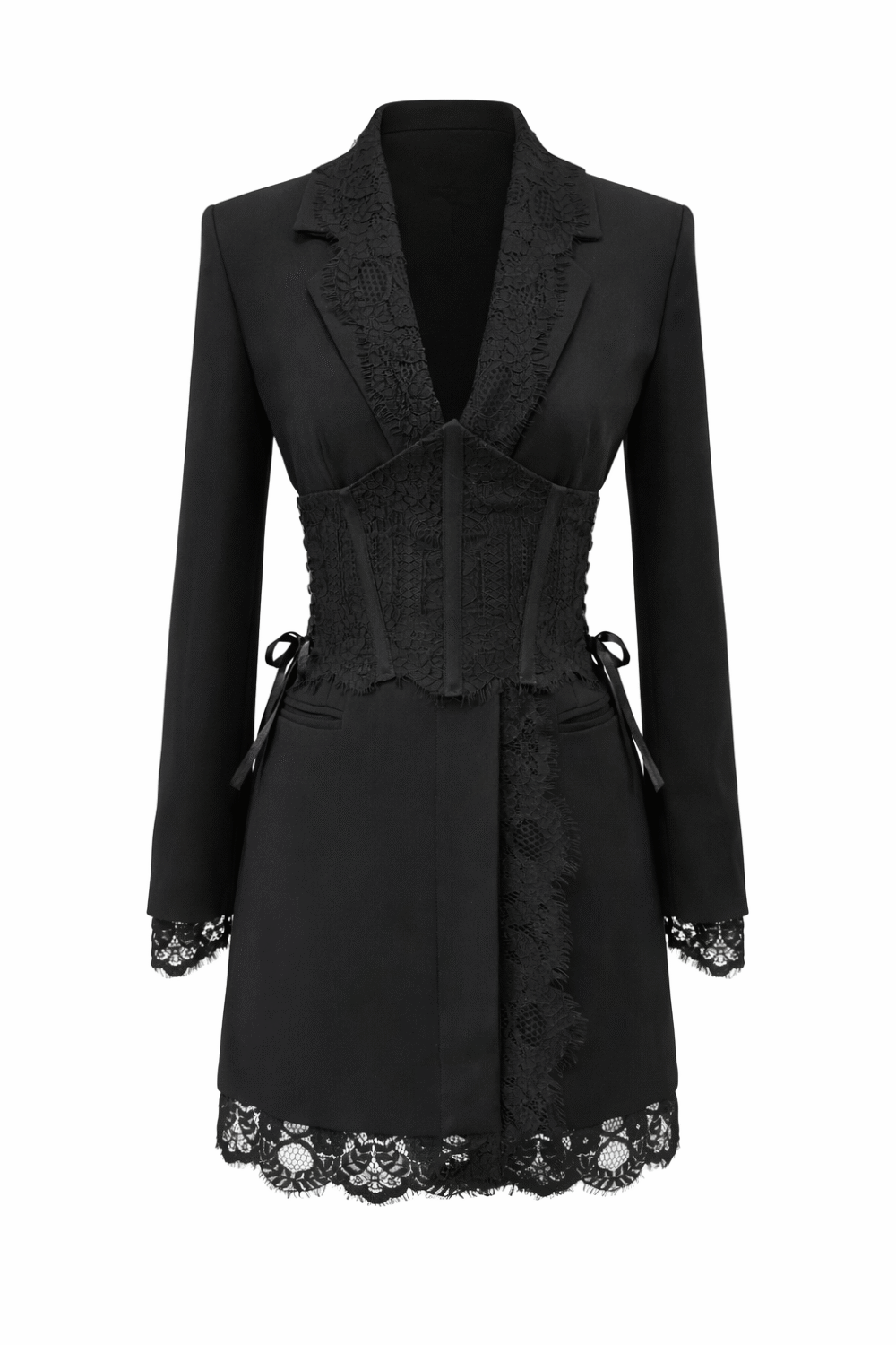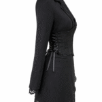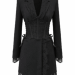 Елегантна рокля-сако, съчетаваща класическа кройка с изтънчени детайли. Моделът е обточен с фина италианска дантела, която придава женственост и деликатен контраст на строгия силует. Реверите и джобовете подчертават изискания стил, а допълнителният дантелен корсет с връзки от двете страни оформя талията и внася нотка драматичност. Подплатата от вискоза осигурява комфорт и лекота при носене.