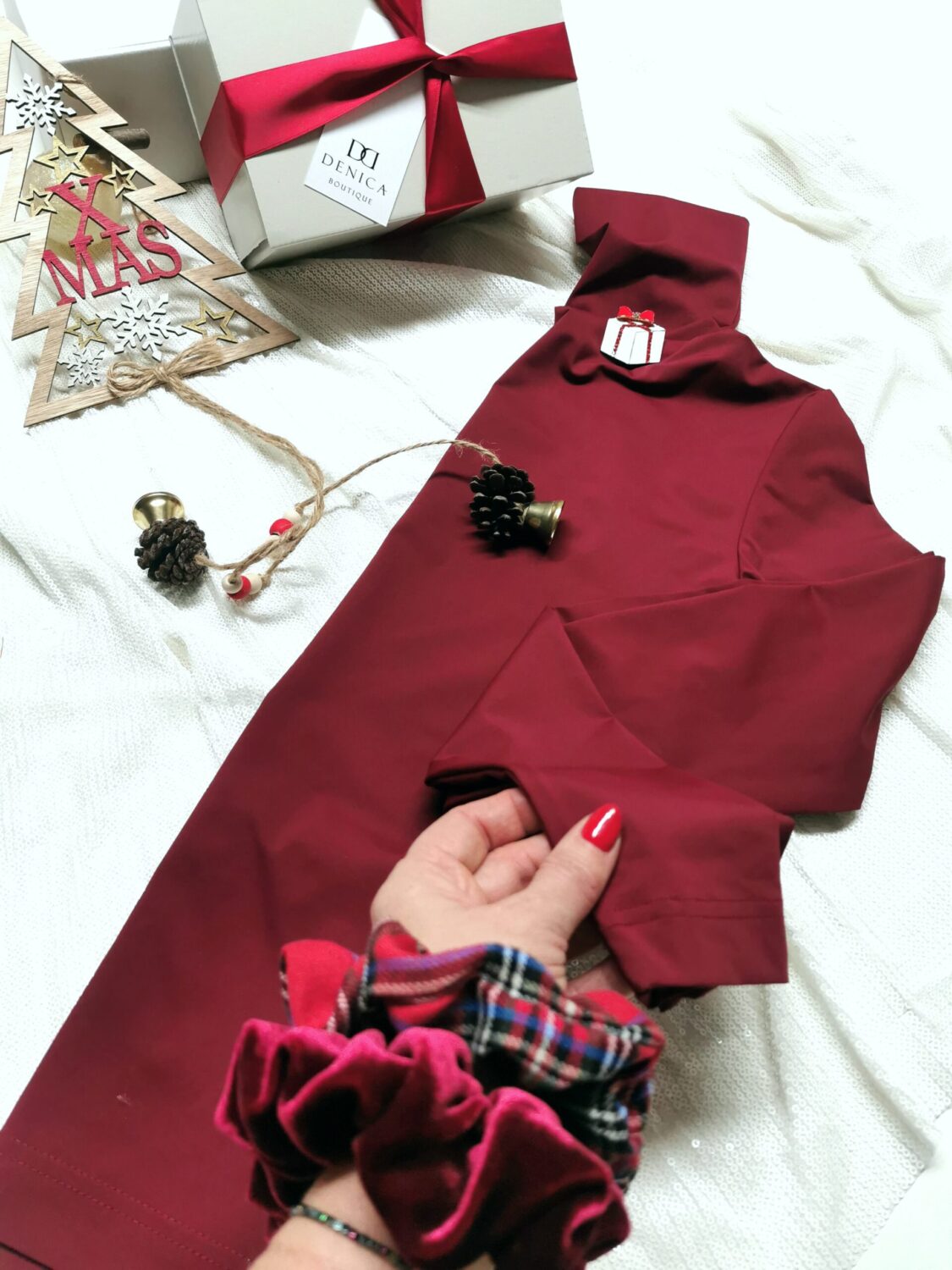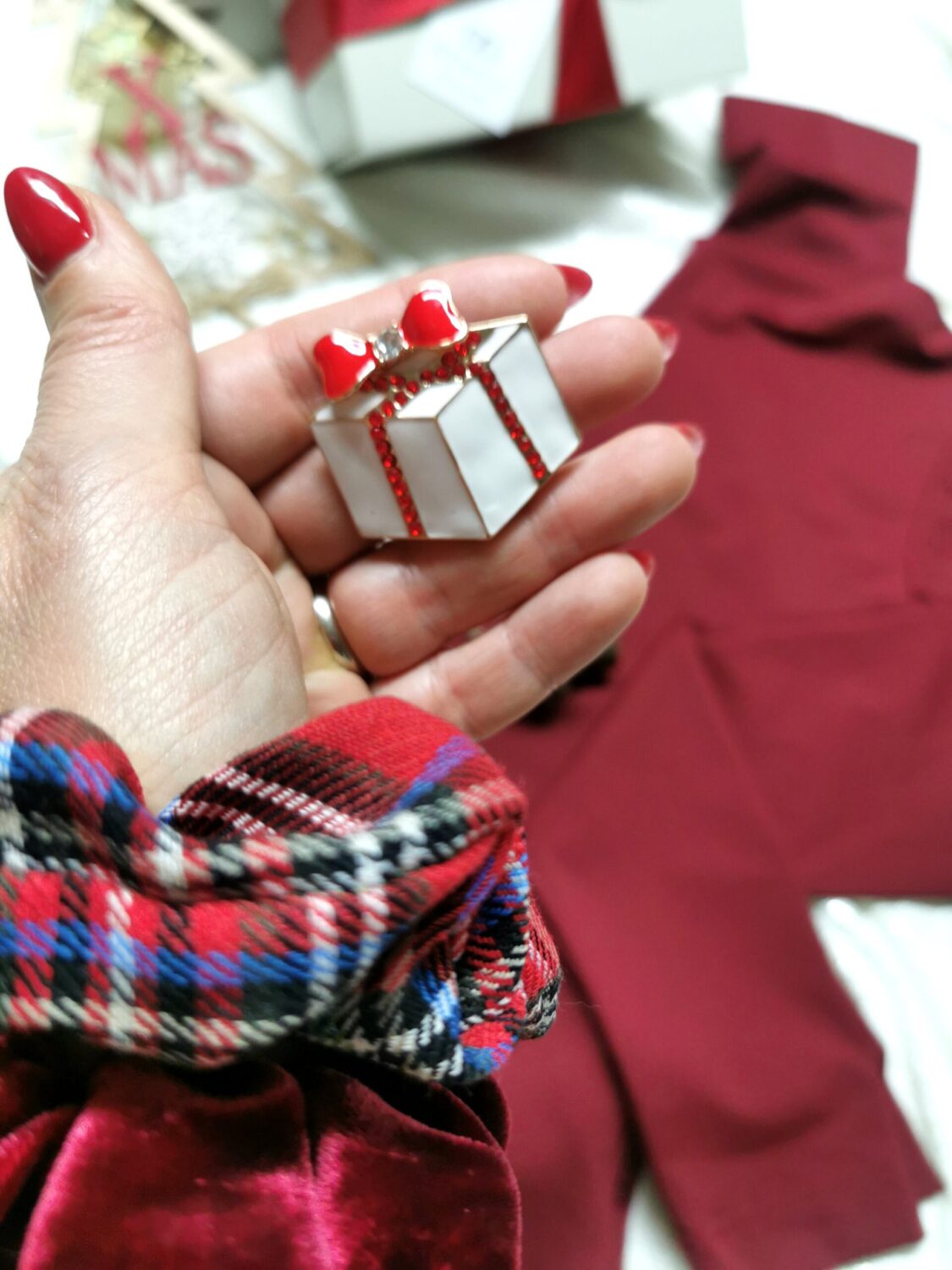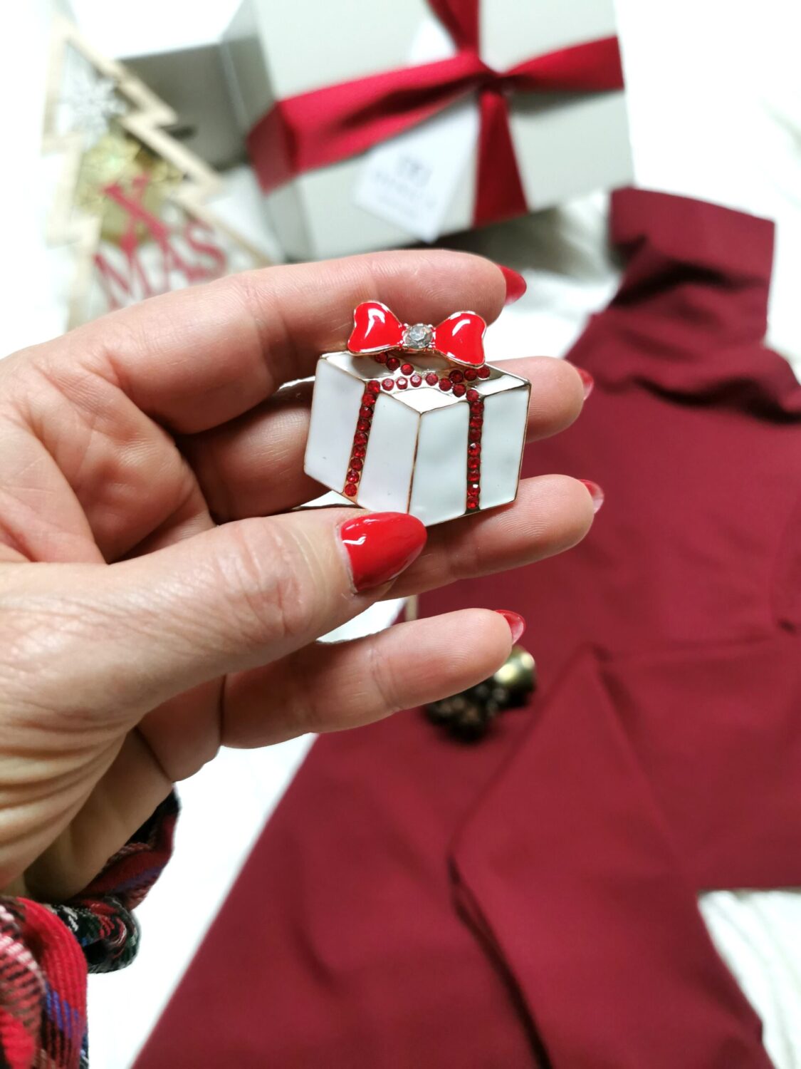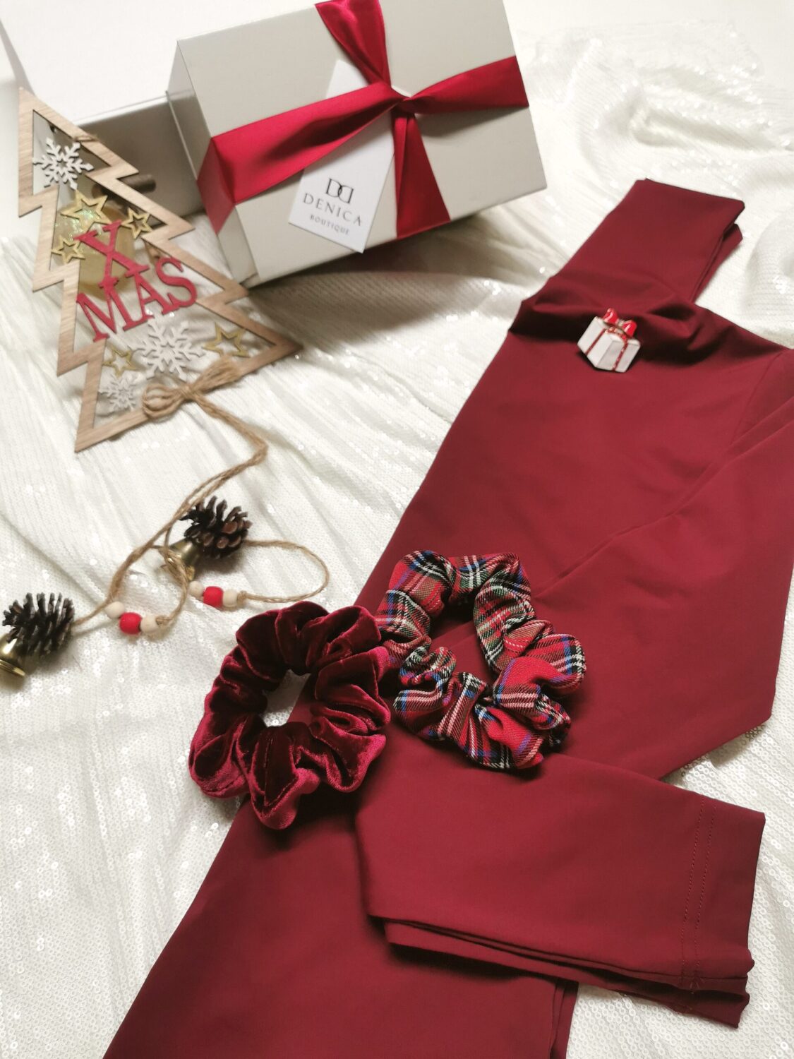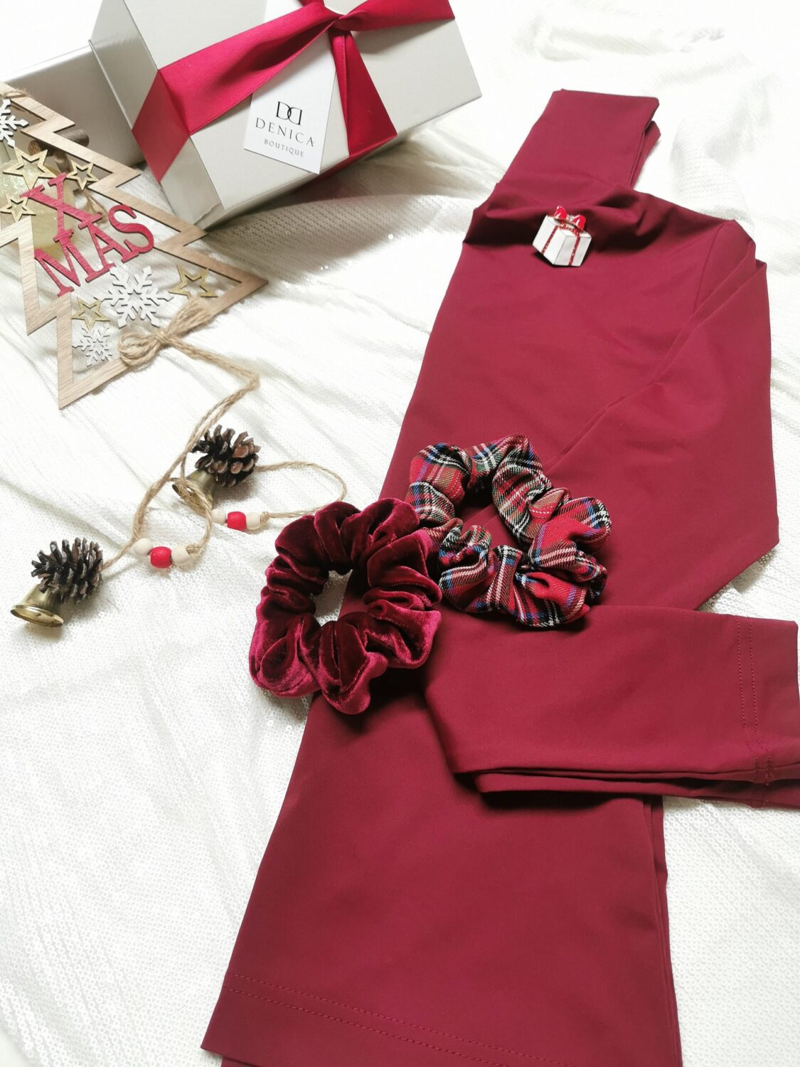 поло блуза, скрънчи, коледна брошка и красива опаковка с панделка.