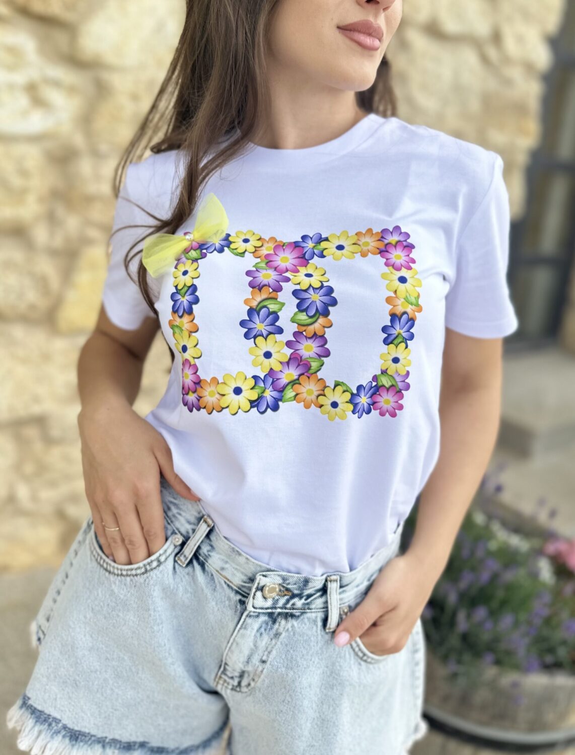 Нова тениска с нашето лого, обсипано в свежи цветенца, 3D панделка и малка златиста буквичка “D”